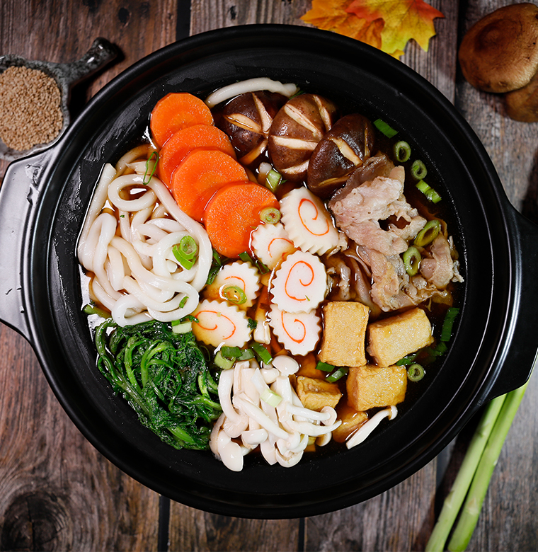 牛肉、烏冬面、包心魚豆腐、凍豆腐、香菇、胡蘿卜、葡萄酒、釀造醬油、冰糖